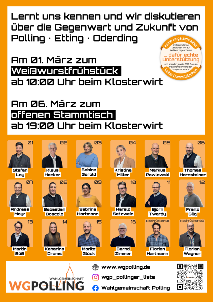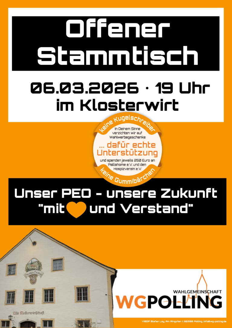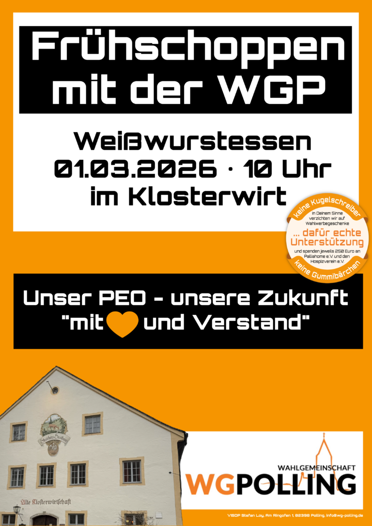 Als engagierte Pollinger Bürgerinnen und Bürger setzen wir uns seit Jahrzehnten erfolgreich für unsere Gemeinde ein. Unsere Stärke: Wir kennen Polling – seine Geschichte, seine Menschen und seine Zukunftspotenziale. Denn wer die Vergangenheit kennt, kann die Gegenwart aktiv mitgestalten.